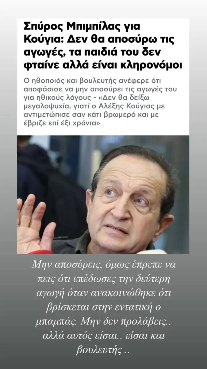 «Μην αποσύρεις, όμως έπρεπε να πεις ότι επέδωσες τη δεύτερη αγωγή όταν ανακοινώθηκε ότι βρίσκεται στην εντατική ο μπαμπάς. Μην δεν προλάβεις… Αλλά αυτός είσαι… Είσαι και βουλευτής…», έγραψε όλο νόημα στο story που ανέβασε στο Instagram ο Χρίστος Κούγιας.