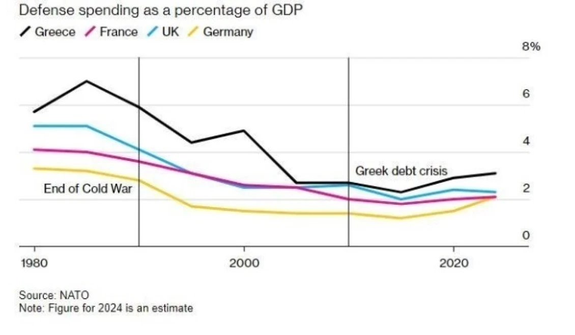 Καθώς η Ευρώπη αναζητά τρόπους να αυξήσει τις στρατιωτικές δαπάνες απέναντι στην απειλή της Ρωσίας, η Ελλάδα προσφέρει πολύτιμα μαθήματα για το τι απαιτείται όταν ζεις δίπλα σε έναν αντίπαλο.