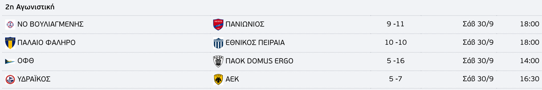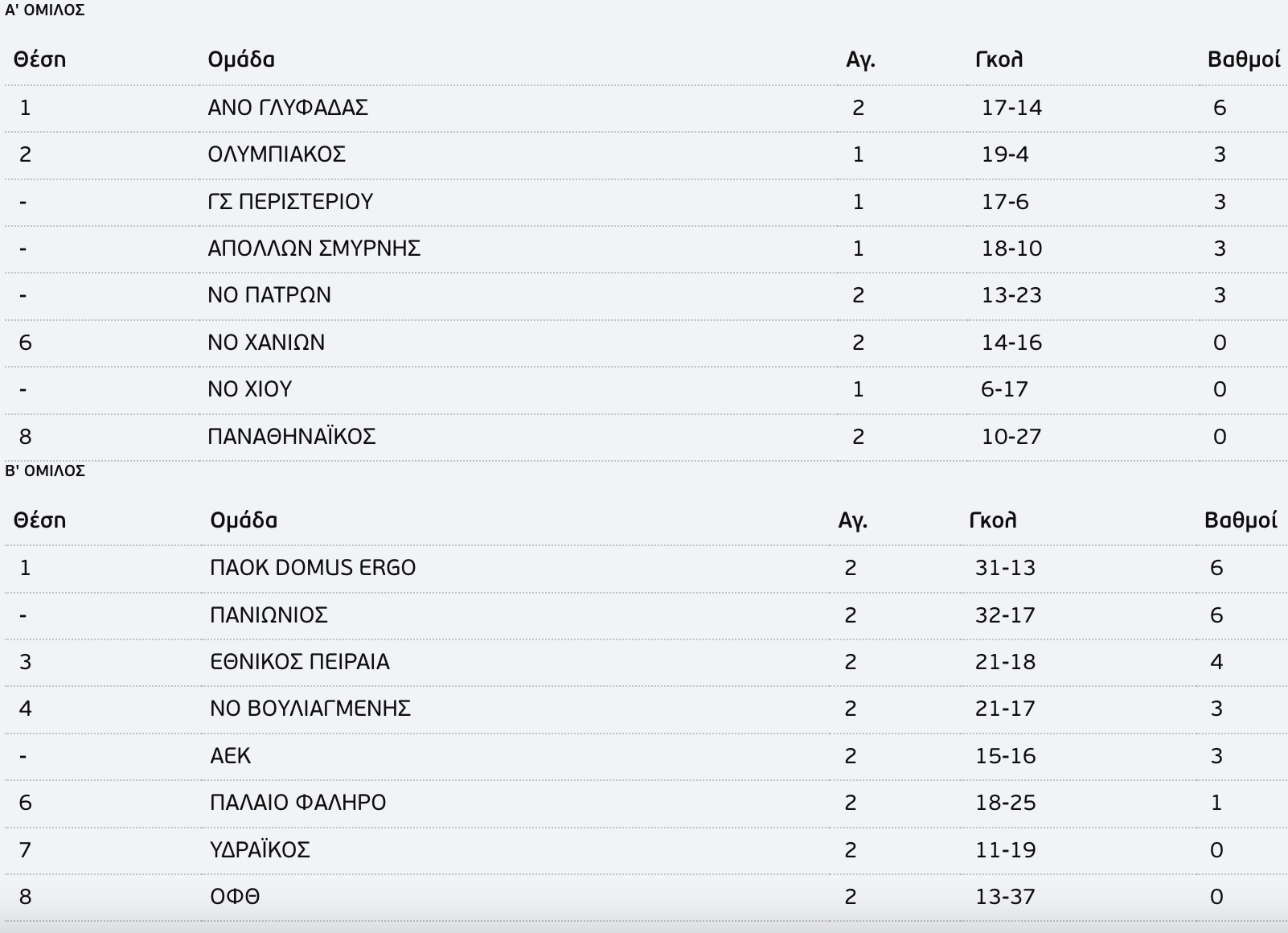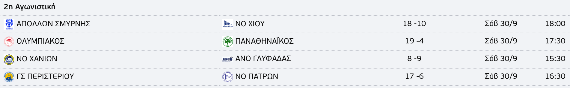 Επίσης, από τον Α’ όμιλο τράβηξαν τα βλέμματα οι νίκες του Απόλλων Σμύρνης επί του ΝΟ Χίου με 18-10 και του ΓΣ Περιστερίου κόντρα στον ΝΟ Πατρών με 17-6.