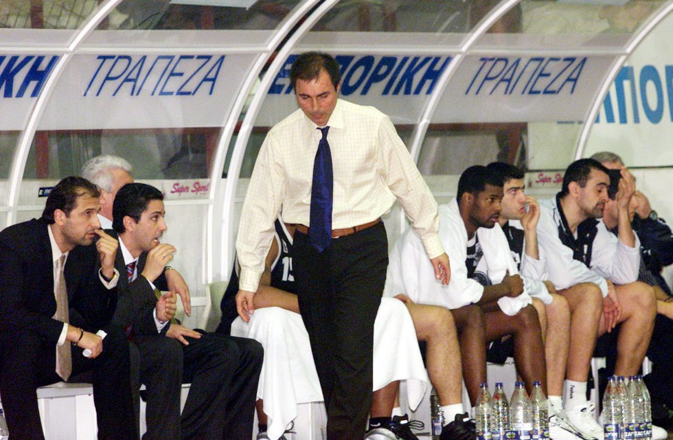 *Αριστερά στον πάγκο ο Πρέλεβιτς μαζί με τον Σφαιρόπουλο και Βαγγέλης Αλεξανδρής ο τότε προπονητής του ΠΑΟΚ