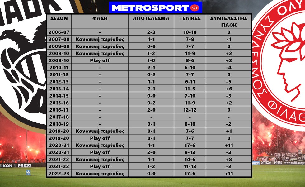 Ο Δικέφαλος πάντως έχει μόνο μία εντός έδρας νίκη στα τελευταία επτά, εντός έδρας παιχνίδια με τον Ολυμπιακό και μετά τη χρονιά του νταμπλ (1 νίκη – 3 ισοπαλίες – 3 ήττες). Σε αυτά τα επτά παιχνίδια είχε μόλις πέντε γκολ σε 82 τελικές προσπάθειες (ένα γκολ ανά 16,4 τελικές)!