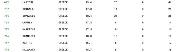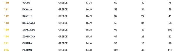 Ακολουθούν τα Τρίκαλα στην 75η θέση (72 λιγότεροι θάνατοι, έναντι 46 με τα όρια του 2005), η Κατερίνη στην 78η θέση (55 λιγότεροι θάνατοι, έναντι 36 με τα όρια του 2005), ο Βόλος αρκετά πίσω, στην 110η θέση (69 θάνατοι έναντι 42 με τα όρια του 2005), η Καβάλα στην 111η (53 θάνατοι, έναντι 31), η Ξάνθη στην αμέσως επόμενη (37 θάνατοι έναντι 22), η Καλαμάτα (53 έναντι 31), το Ηράκλειο στην 180ή (90 θάνατοι έναντι 49), τα Ιωάννινα (47 θάνατοι, έναντι 25), τα Χανιά στην 211η θέση (33 θάνατοι έναντι 16) και, τέλος, η Πάτρα στην 226 θέση (102 θάνατοι έναντι 48).