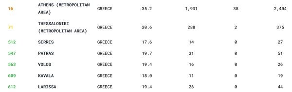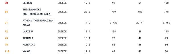 Σύμφωνα με τα στοιχεία του ISGlobal, που δημοσιεύονται στην ιστοσελίδα του, η ελληνική πόλη με τη μεγαλύτερη επιβάρυνση του δείκτη θνησιμότητας από τα μικροσωματίδια παρουσιάζεται να είναι οι Σέρρες (θέση 30 διεθνώς), όπου εκτιμάται ότι θα μπορούσαν να αποφευχθούν 92 ετήσιοι πρόωροι θάνατοι αν ίσχυαν τα νέα όρια του ΠΟΥ (έναντι 61 με τα όρια του 2005), η Θεσσαλονίκη (θέση 64 – 719 λιγότεροι θάνατοι, έναντι 488 με τα όρια του 2005), η Αθήνα (θέση 71 – 3.433 λιγότεροι θάνατοι, έναντι 2.141 με τα όρια του 2005) και η Λάρισα (θέση 72 – 134 λιγότεροι θάνατοι, έναντι 89 με τα όρια του 2005). Εάν η Θεσσαλονίκη μείωνε τα επίπεδα της ρύπανσης στα χαμηλότερα όρια μεταξύ των εξεταζόμενων πόλεων της Ευρώπης θα γλύτωνε 778 θανάτους.