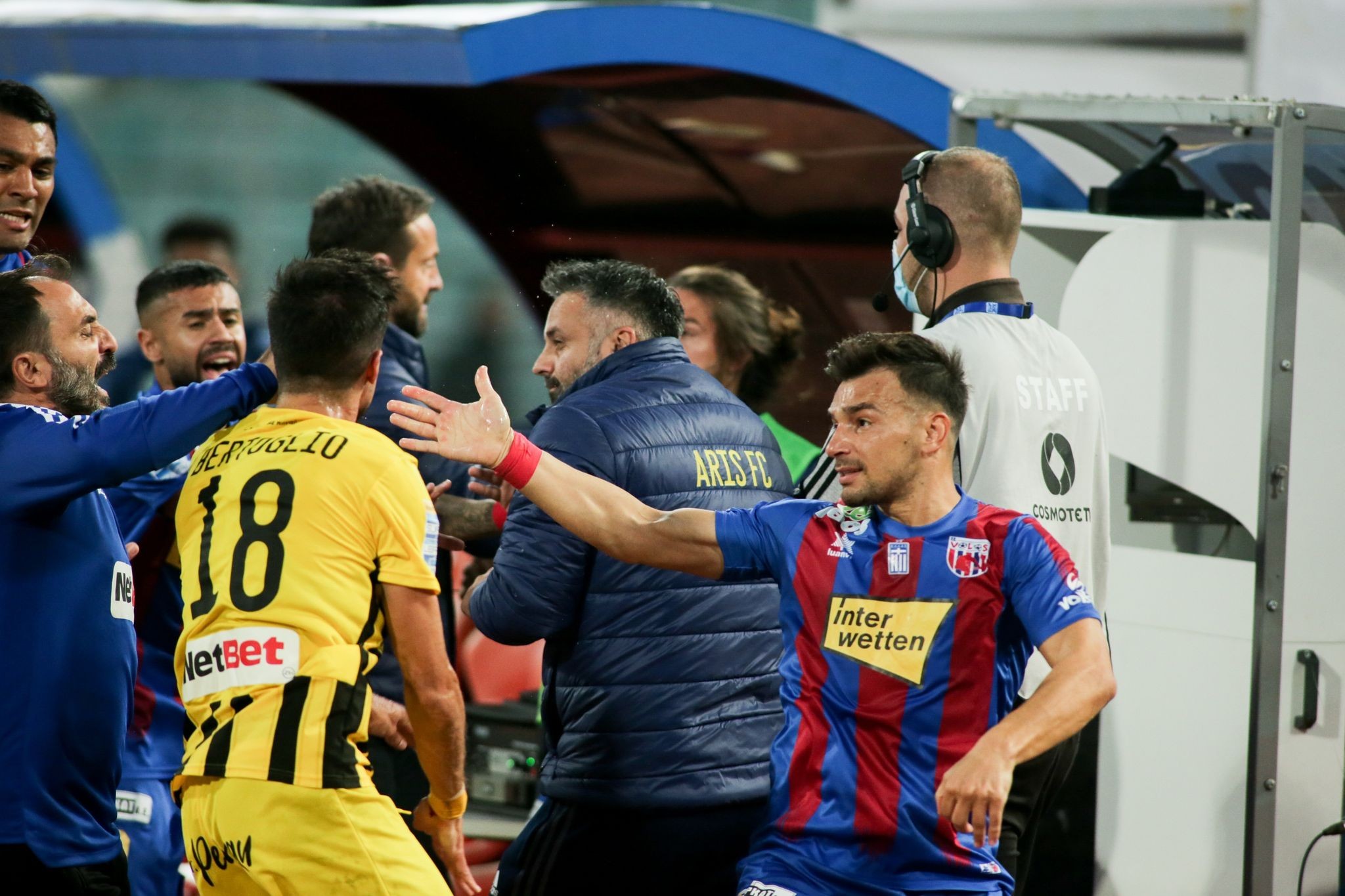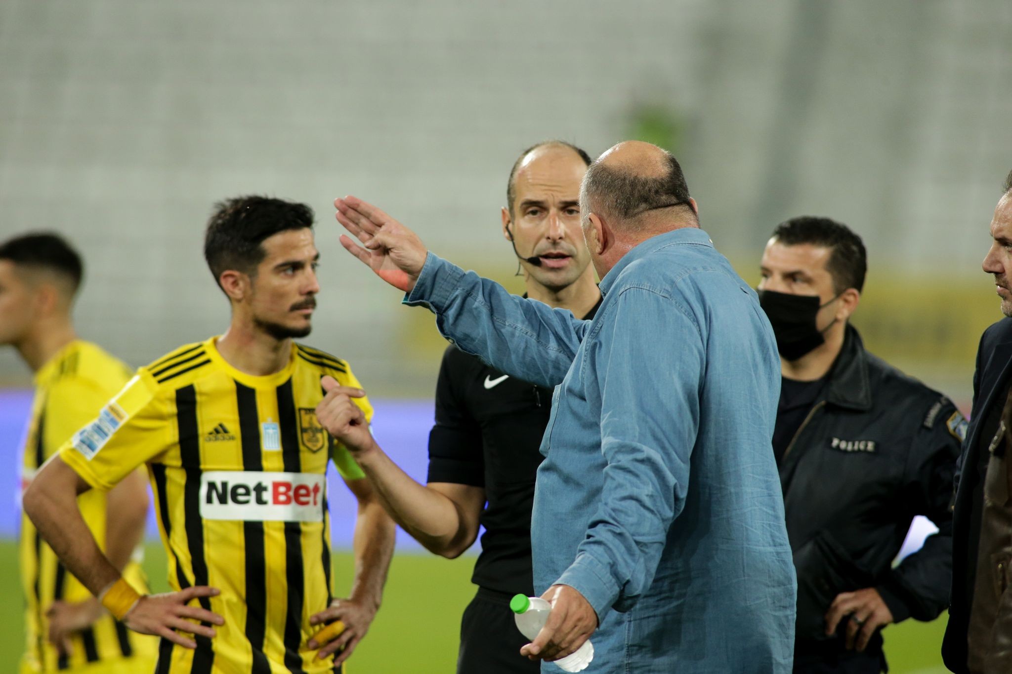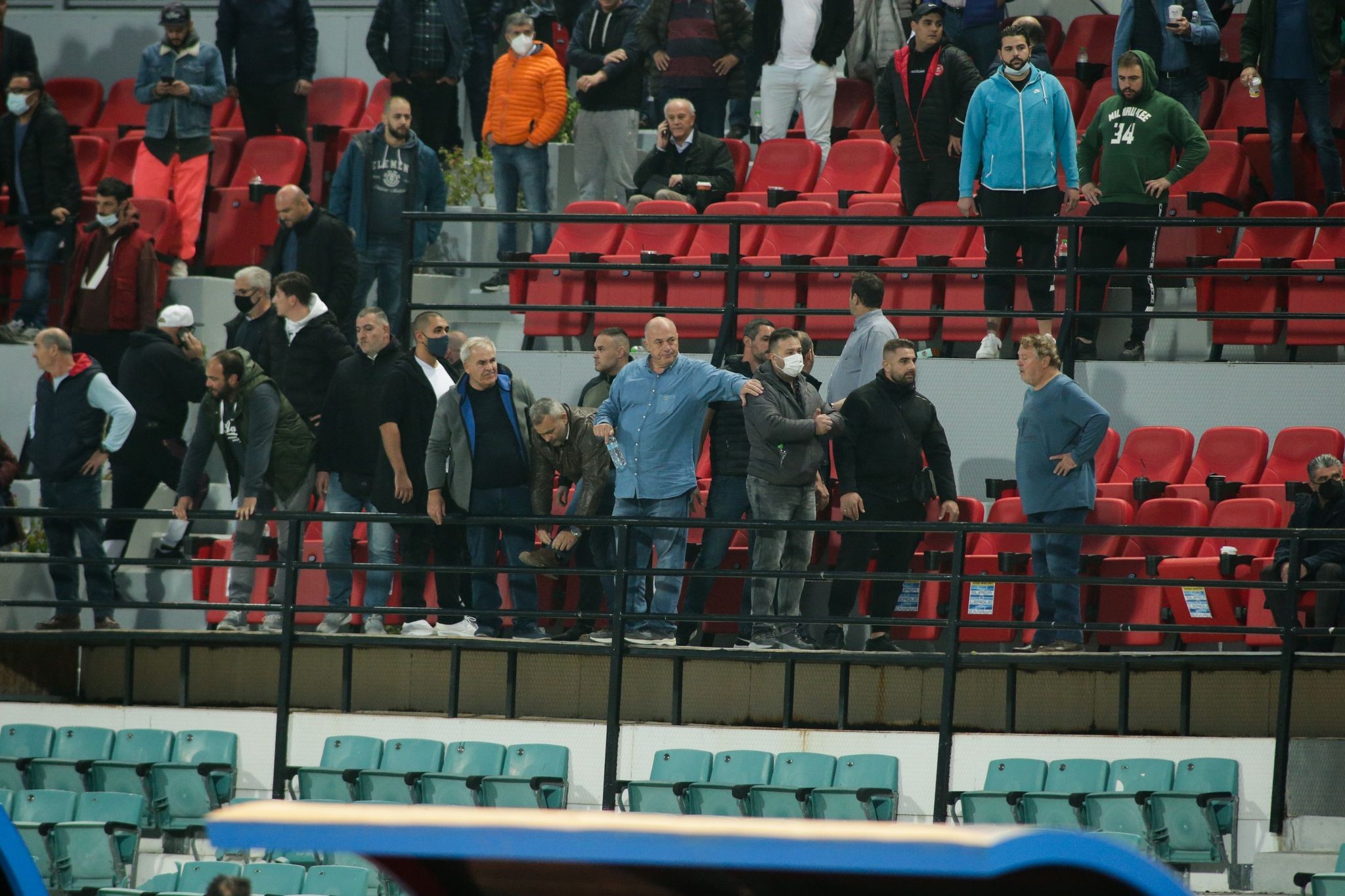 Ο Γιώργος Δεληζήσης πήγε προς την κερκίδα που βρίσκονται οι οπαδοί του Άρη και τους ζήτησε να ηρεμήσουν.