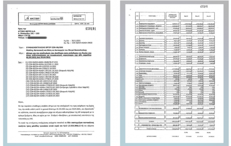 Με έγγραφό της στις 30.11.2021 η Ακτωρ υποβάλλει αίτημα για αποζημίωσή της «προς ανόρθωση της ζημίας, την οποία υπέστη κατά το χρονικό διάστημα 1.2.2021 έως και 30.4.2021 και εξακολουθεί να υφίσταται», όπως σημειώνει, «συνεπεία συνεχιζόμενων μέχρι και σήμερα καθυστερήσεων της Α.Μ. αναφορικά με τα κρίσιμα ζητήματα, ιδίως σε σχέση με τον Σταθμό “Βενιζέλου” με αποκλειστική υπαιτιότητα της τελευταίας ως ΚτΕ (σημ. κυρίου του έργου). Το ποσό της αιτούμενης αποζημίωσης ανέρχεται συνολικά σε δυο εκατομμύρια πεντακόσιες πενήντα τρεις χιλιάδες τριακόσια εννιά ευρώ και 0,12 (2.553.309,12 €)», δηλαδή για 3 μήνες.