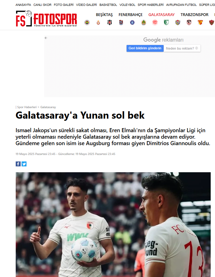 «Η Γαλατασαράι συνεχίζει την αναζήτηση αριστερού μπακ, καθώς ο Ισμαήλ Γιάκοπς είναι συνεχώς τραυματίας και ο Ερέν Ελμαλί δεν είναι έτοιμος για το Champions League. Το τελευταίο όνομα που ήρθε στην ατζέντα είναι ο Δημήτριος Γιαννούλης, ο οποίος αγωνίζεται στην Άουγκσμπουργκ».