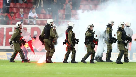 «Μετά τη λήξη του ποδοσφαιρικού αγώνα Ολυμπιακός – ΠΑΟΚ που διεξήχθη στο στάδιο Καραϊσκάκη, ομάδα ατόμων που εξήλθε του γηπέδου επιτέθηκε στις αστυνομικές δυνάμεις με πέτρες, ξύλα και άλλα αντικείμενα. Συνελήφθησαν 11 άτομα. Προανάκριση διενεργείται από την ΥΑΒΑΧ».