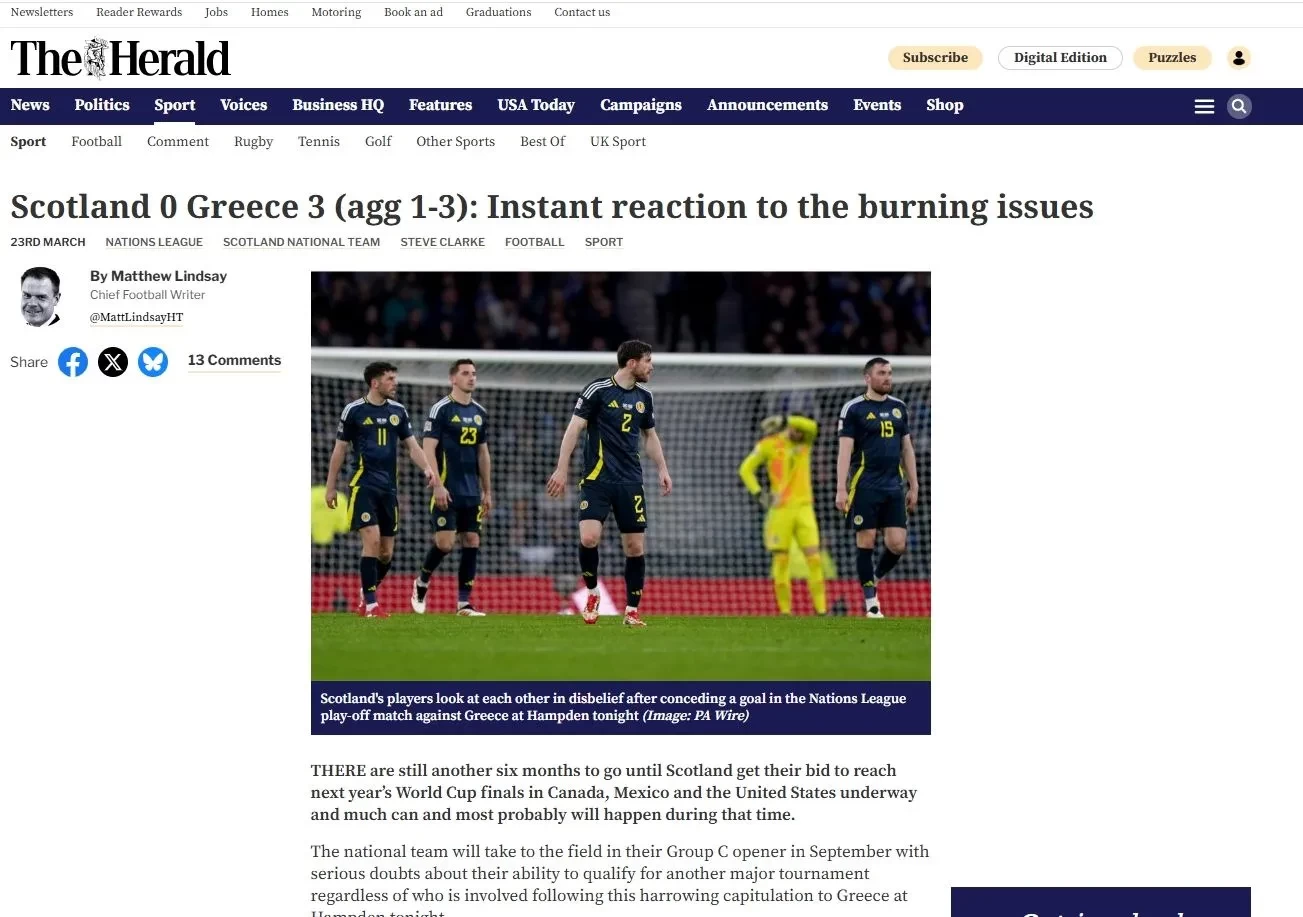 «Πυροβολήθηκε κάτω από την Ακρόπολη»: Αποθέωση της Εθνικής από τα ΜΜΕ της Σκωτίας