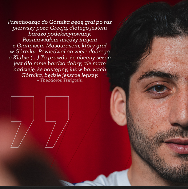 «Είναι αλήθεια πως η φετινή σεζόν είναι πολύ καλή για μένα, αλλά ελπίζω πως η επόμενη, με τη φανέλα της Γκόρνικ, θα είναι ακόμα καλύτερη», πρόσθεσε με χαμόγελο. Το συμβόλαιο του Τσιριγώτη με την Γκόρνικ θα έχει ισχύ έως τις 30 Ιουνίου 2027, με οψιόν ανανέωσης.