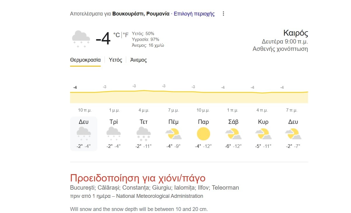 Μάλιστα, όπως φαίνεται στις φωτογραφίες από την πόλη, η χιονόπτωση έχει καλύψει το Βουκουρέστι με την πρόγνωση του καιρού να προβλέπει πως αντίστοιχο θα είναι το μοτίβο του καιρού και για τις επόμενες τουλάχιστον δύο ημέρες με τις θερμοκρασίες την Τετάρτη να φτάνουν τους -11 βαθμούς.