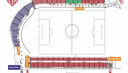 Η είσοδος των φιλάθλων της φιλοξενούμενης ομάδας θα πραγματοποιηθεί από τη Θύρα 1 και η τοποθέτηση τους θα γίνει στην κερκίδα Κουλούρη (πέταλο). Η είσοδος των φιλάθλων της ομάδας μας θα πραγματοποιηθεί από τις υπόλοιπες Θύρες και συγκεκριμένα από τις Θύρες 2,3 και 4. Η είσοδος των κατόχων διαρκείας για τη Θύρα 4, καθώς για τις θέσεις των επισήμων θα πραγματοποιηθεί από τη Θύρα 4.