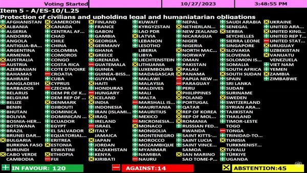 Η μη δεσμευτική απόφαση, που καταγγέλθηκε από το Ισραήλ και τις ΗΠΑ επειδή στο κείμενο δεν αναφέρεται η Χαμάς, εγκρίθηκε με 120 ψήφους υπέρ, 14 κατά και 45 αποχές.