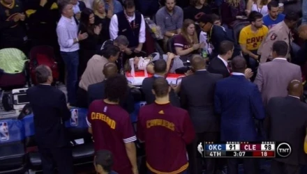 Τα 203 εκατοστά και τα 113 κιλά του κορμιού του αστέρα των Καβαλίερς προσγειώθηκαν με δύναμη πάνω στην άτυχη γυναίκα που αποχώρησε με φορείο από την «Quicken Loans Arena» για το πλησιέστερο νοσοκομείο.