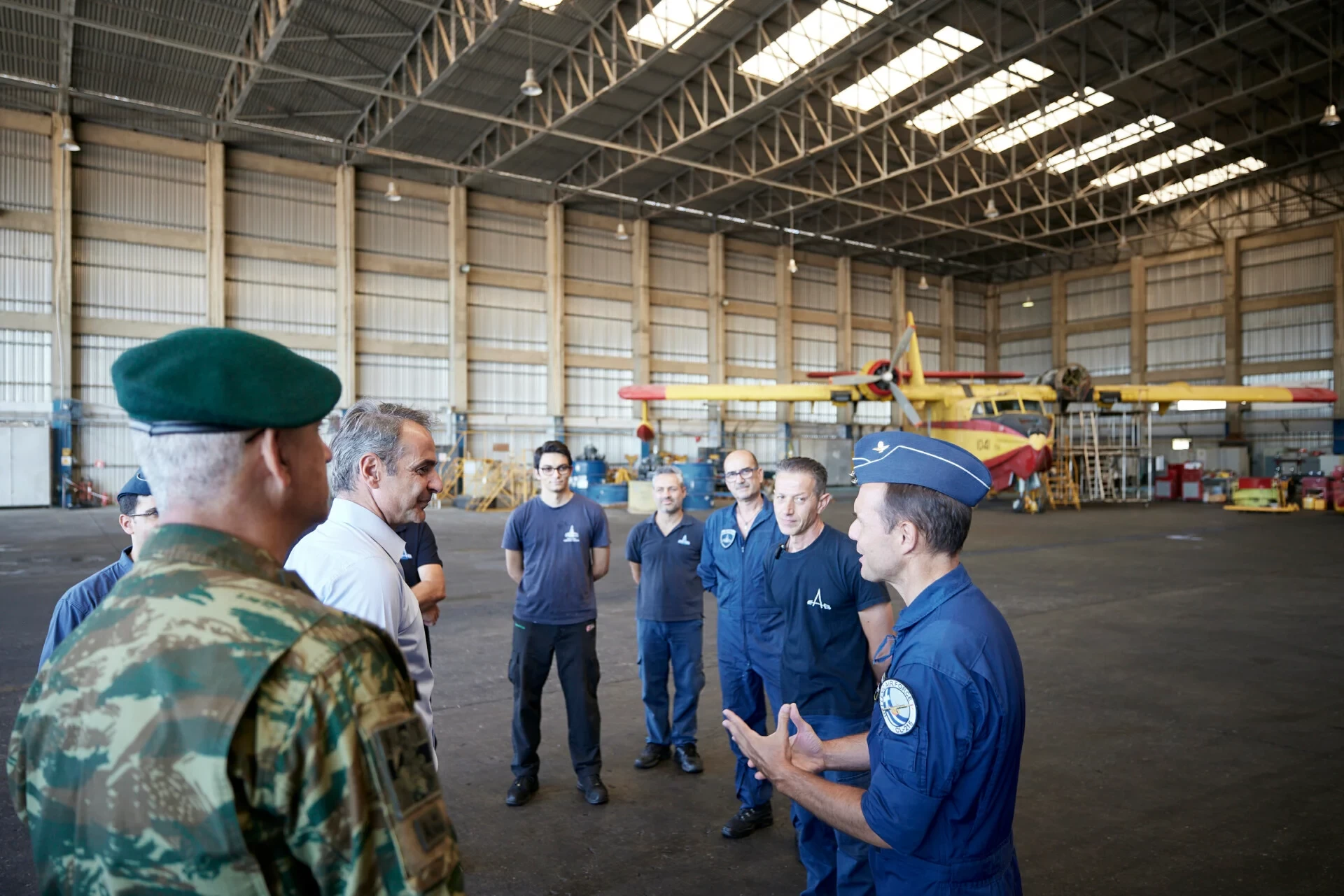 Ο Κυριάκος Μητσοτάκης, ενημερώθηκε για τις αποστολές των πυροσβεστικών αεροσκαφών Canadair CL-215 και CL-415 που συμβάλλουν στο απαιτητικό έργο κατάσβεσης των πυρκαγιών, ενώ επισκέφθηκε και τη Μοίρα Συντήρησης Αεροσκαφών, όπου συνομίλησε με τους τεχνικούς που συντηρούν τα αεροσκάφη καθ’ όλη τη διάρκεια του 24ωρου για να ανταποκρίνονται με αποτελεσματικότητα στις αποστολές τους.