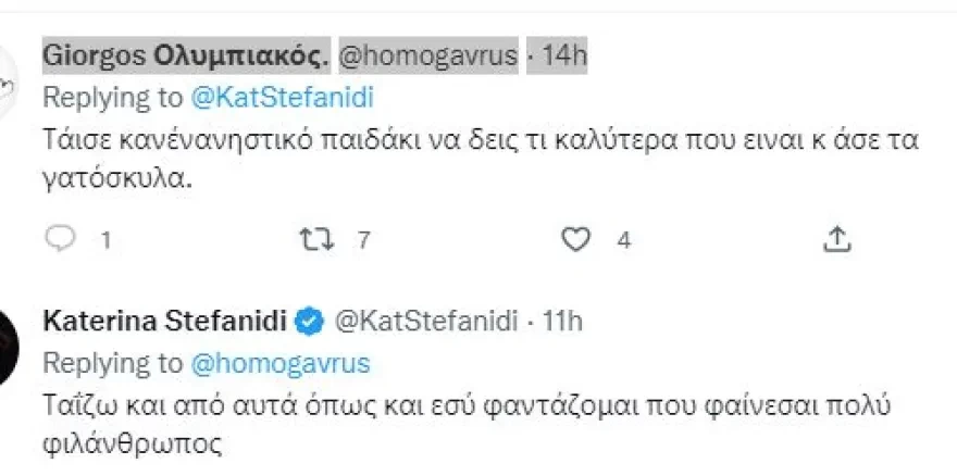 Μέσα στους πολλούς που αποθέωσαν την Κατερίνα Στεφανίδη για την προτροπή της, υπήρξαν και κάποιοι της επιτέθηκαν. «Άσε τα γατιά και γίνε μάνα, πριν το ρολόι της φύσης τελειώσει» της έγραψε ένας χρήστης του Twitter.