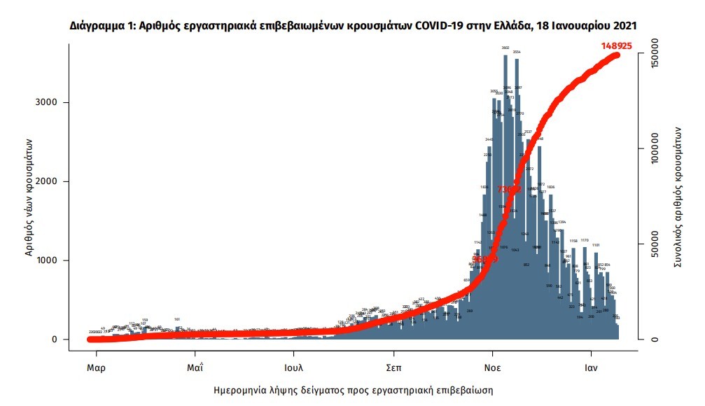 Έτσι, ο συνολικός αριθμός των κρουσμάτων ανέρχεται στα 148.925, εκ των οποίων 52.1% άνδρες. Κατά την ιχνηλάτιση βρέθηκε ότι 5.763 (3.9%) θεωρούνται σχετιζόμενα με ταξίδι από το εξωτερικό και 45.578 (63.7%) είναι σχετιζόμενα με ήδη γνωστό κρούσμα.