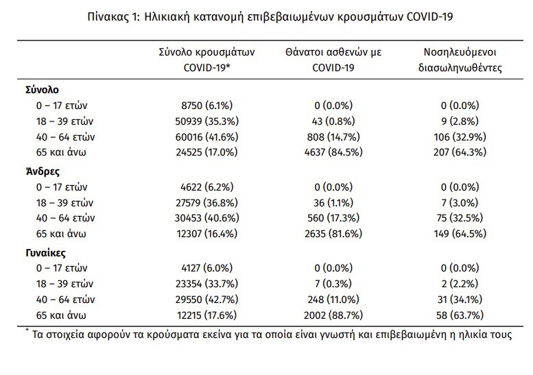 Η διάμεση ηλικία των κρουσμάτων είναι 44 έτη (εύρος 0.2 έως 104 ετών), ενώ η διάμεση ηλικία των θανάτων είναι 79 έτη (εύρος 24 έως 103 ετών). Η ηλικιακή κατανομή των (α) συνολικών κρουσμάτων, (β) των περιστατικών που κατέληξαν σε θάνατο και (γ) των ασθενών που νοσηλεύονται διασωληνωμένοι, είναι η ακόλουθη: