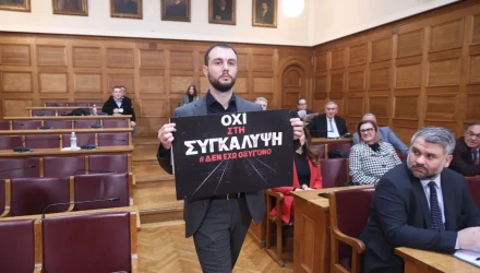 Το περιστατικό σημειώθηκε στην έναρξη της συνεδρίασης της κοινοβουλευτικής επιτροπής Κοινωνικών Υποθέσεων και το πανό έγραφε «Όχι στη Συγκάλυψη».