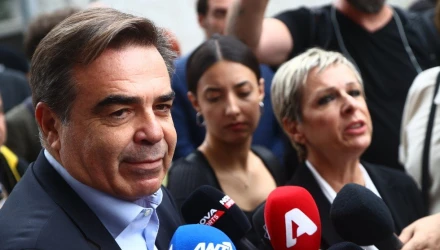 Ο Ευρωπαίος Επίτροπος και γνωστός φίλος του Άρη, Μαργαρίτης Σχοινάς, μίλησε στους εκπροσώπους του Τύπου μετά τον αποχαιρετισμό του κόσμου στον Γιάννη Ιωαννίδη έξω από το Αλεξάνδρειο.