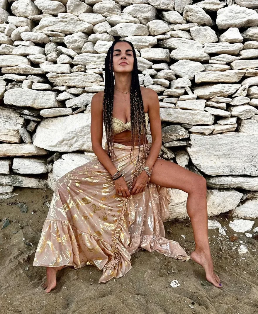Ο τελευταίος καλοκαιρινός προορισμός, από όσα μοιράζεται στο Instagram, ήταν η Κύθνος, από όπου και ανέβασε μερικά ακόμη στιγμιότυπα. Το μεσημέρι της Δευτέρας 4 Σεπτεμβρίου, η ηθοποιός ανέβασε νέα στιγμιότυπα, στα οποία ποζάρει ντυμένη στα χρυσά.