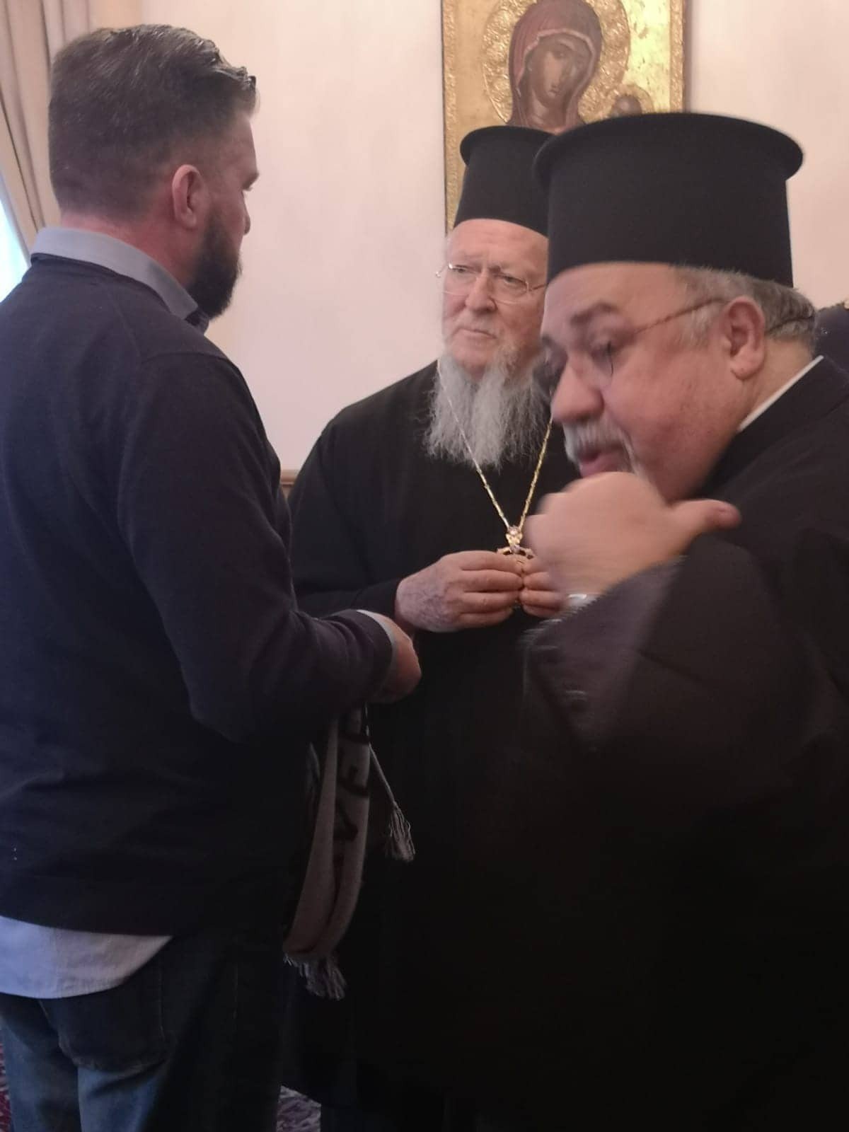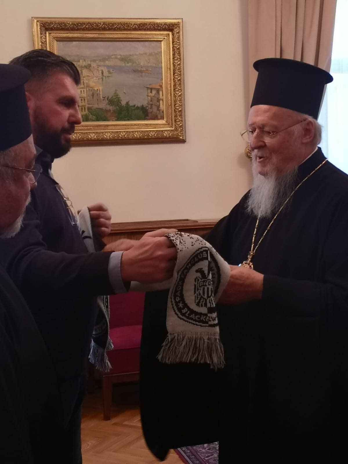 Στη συνέχεια ο Δημήτρης Χατζόγλου ζήτησε να δώσει δώρο ένα κασκόλ του ΠΑΟΚ στον Παναγιώτατο. Εκείνος το δέχθηκε με μεγάλη χαρά, ρώτησε τον Δημήτρη από που είναι, ο Δημήτρης είπε στον Πατριάρχη πως ζήτησε να του δώσει το κασκόλ γιατί πριν 94 χρόνια κάποιοι Κωνσταντινουπολίτες έχτισαν μια ομάδα στην Θεσσαλονίκη για να τους θυμίζει την Πόλη, και πως αυτή την ιδέα μεταδίδουν ως σύνδεσμος στην Γερμανία και αυτή η ομάδα είναι τώρα πρωταθλήτρια. Ο Πατριάρχης του είπε πως θα βγει φωτογραφίες με το κασκόλ μαζί τους.