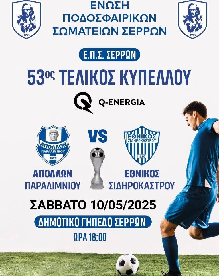 Ο τελικός κυπέλλου της ΕΠΣ Σερρών Απόλλων Παραλιμνίου-Εθνικός Σιδηροκάστρου θα γίνει σήμερα στις 18.00 στο δημοτικό γήπεδο Σερρών.