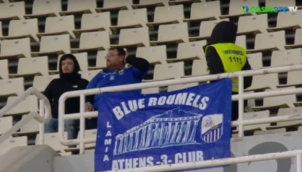 Η κάμερα της τηλεοπτικής μετάδοσης της Cosmote TV έπιασε δυο φίλους της ομάδας τη Φθιώτιδας να κάθονται μόνοι τους στη θύρα που παραχωρήθηκε στη Λαμία στο ΟΑΚΑ, έχοντας μάλιστα και πανό που έγραφε «Blue Roumels, Αthens -3- Club».