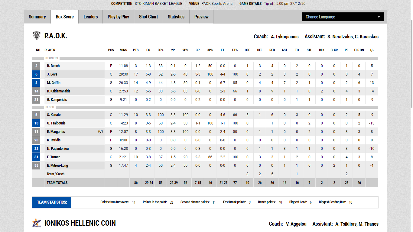 Στη συνέχεια του τέταρτου δεκαλέπτου ο Ιωνικός πίεσε αρκετά είχε τις δικές του στιγμές βάζοντας πολύ δύσκολα στον ΠΑΟΚ, αλλά ο Δικέφαλος φάνηκε πολύ σκληρός για να πεθάνει και με την εμπειρία του Γκρίφιν και τα πολύτιμα καλάθια του Λοβ κατάφερε να πάρει μία σπουδαία νίκη και να κλείσει με τον καλύτερο τρόπο το 2020!