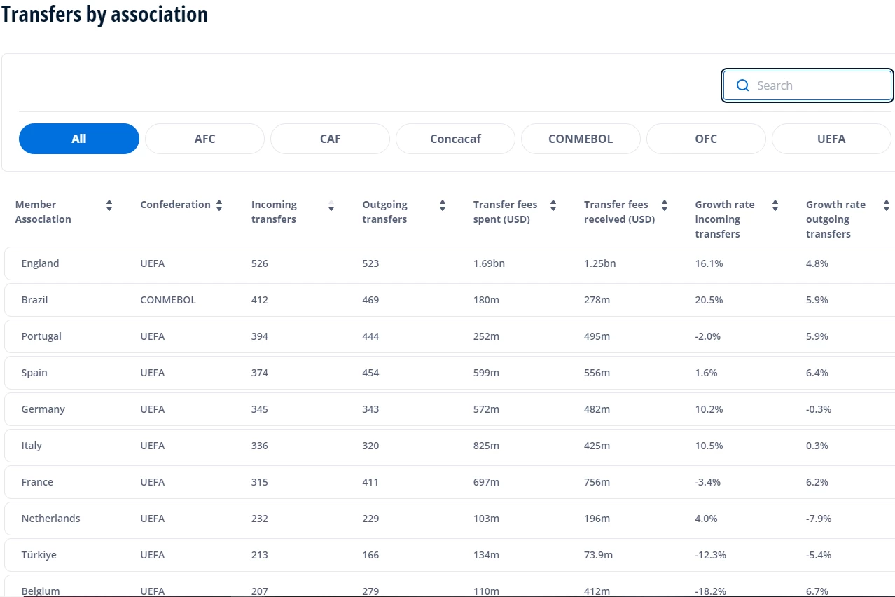 Συνολικά, στο επαγγελματικό ποδόσφαιρο ανδρών, πραγματοποιήθηκαν σχεδόν 11.000 διεθνείς μεταγραφές στο τρίμηνο, που αποτελεί ρεκόρ όλων των εποχών και ισοδυναμεί με αύξηση 4,8% από το 2023. Ακόμη, δαπανήθηκαν περίπου 5,8 δισ. ευρώ, ως το 2ο υψηλότερο υψηλό στα χρονικά, αν και μειωμένο κατά 13,06% από το 2023. Στο γυναικείο ποδόσφαιρο, δαπανήθηκαν 6,15 εκατ. ευρώ για διεθνείς μεταγραφές, υπερδιπλάσιο ποσοστό από πέρσι.