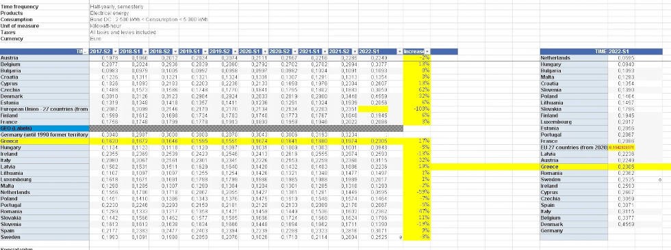 Στον πίνακα της Eurostat μπορείτε να δείτε τα στοιχεία για τον τυπικό, μέσο οικιακό καταναλωτή: Ποια είναι η τελική τιμή που πληρώνει για την ενέργεια. Στοιχεία εξαμηνιαία, σε ευρώ ανά kWh.