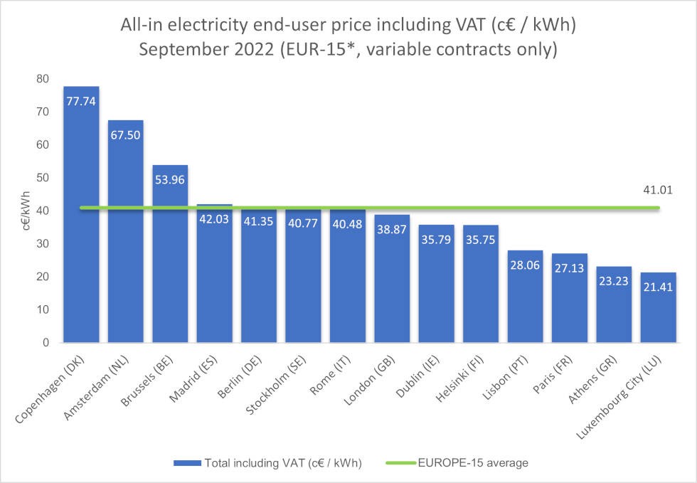 Μάλιστα παραθέτουν πίνακα που δείχνει ότι η τιμή λιανικής στην Ελλάδα (χώρες με κυμαινόμενα τιμολόγια) είναι η δεύτερη φθηνότερη στην Ευρώπη τον Σεπτέμβριο 2022: