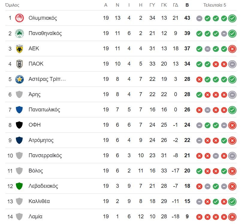 Super League: Χαμένοι ΠΑΟΚ και Άρης, πήρε διαφορά ο Ολυμπιακός-Η βαθμολογία μετά την 19η αγωνιστική