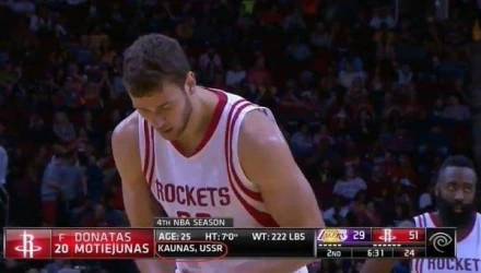 Ο διεθνής Λιθουανός τα «πήρε» με το sportnet, καθώς στον αγώνα με τους Λέικερς, και καθώς εκτελούσε βολές, εμφανίστηκε πινακάκι με τα στοιχεία του παίκτη του Χιούστον. Το λάθος, όμως, ήταν το γεγονός πως το Κάουνας, που είναι η γενέτειρα του Μοτιεγιούνας, αναφέρθηκε ως πόλη της Σοβιετικής Ένωσης. Ο πάουερ φόργουορντ των Ρόκετς ήταν έξαλλος με το συγκεκριμένο λάθος, ζητώντας από το ΝΒΑ να μην επαναληφθεί.