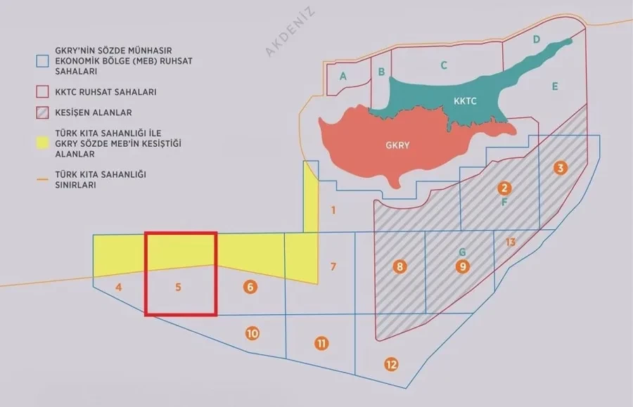 «Η GCASC ανακοίνωσε την Navtex δηλώνοντας ότι θα πραγματοποιήσει γεωτρήσεις για 6 μήνες στο τεμάχιο με αριθμό 5, μέρος του οποίου βρίσκεται εντός της υφαλοκρηπίδας της Τουρκίας. Ένα μέρος αυτού του τεμαχίου ανήκει σε εμάς και βρίσκεται εντός της αποκλειστικής οικονομικής ζώνης μας. Το πετρέλαιο ή το φυσικό αέριο που θα εξορυχθεί από την περιοχή που θα πραγματοποιήσει γεώτρηση η ελληνική πλευρά βρίσκεται εντός του κυρίως τεμαχίου, μέρος του οποίου μας ανήκει και στον γεωλογικό σχηματισμό στην περιοχή μας. Οι αμερικανικές εταιρείες Exxon Mobile και Qatar Energy θα πραγματοποιήσουν γεωτρήσεις στην περιοχή για λογαριασμό της ελληνοκυπριακής διοίκησης της Νότιας Κύπρου.
