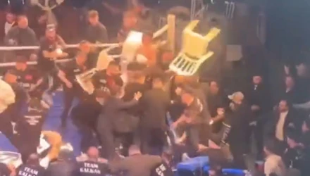 Η αρχική ένταση μεταξύ των μελών των τιμ των αθλητών μετατράπηκε σε μία απίστευτη,... κλωτσοπατινάδα με δεκάδες ανθρώπους να μπαίνουν στο ρινγκ και να χτυπιούνται με γροθιές, κλωτσιές αλλά και... καρεκλιές.