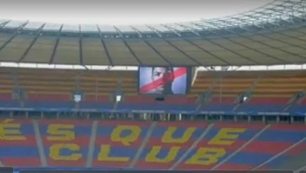 Τώρα λοιπόν ήρθε η σειρά να εμφανιστεί το πρόσωπο του Κριστιάνο Ρονάλντο. Και αυτό δεν συνέβη όπου κι όπου, αλλά στη γιγαντοοθόνη πάνω ακριβώς από το «μωσαϊκο» των οπαδών της Μπάρτσα. Κάτω από τον Ρονάλντο έγραφε «πρόβα». Προφανώς δοκίμαζαν τη λειτουργία της οθόνης, αλλά η αλήθεια είναι ότι θα μπορούσαν να έχουν κάνει καλύτερη επιλογή οι διοργανωτές.