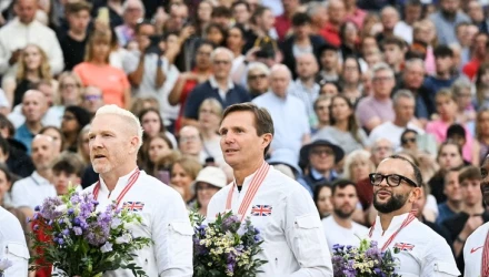 Η τελετή απονομής πραγματοποιήθηκε κατά τη διάρκεια του αγώνα Diamond League στο Λονδίνο, μπροστά σε 60.000 θεατές, με τους Ρότζερ Μπλακ, Ίουαν Τόμας, Τζέιμι Μπόλτς, Μαρκ Ρίτσαρντσον και Μαρκ Χίλτον να ανεβαίνουν στο βάθρο και να ακούν τον εθνικό ύμνο της Μεγάλης Βρετανίας. Η απόφαση ήρθε μετά την αφαίρεση του τίτλου από την ομάδα των ΗΠΑ, λόγω της ομολογίας ντόπινγκ του Αντόνιο Πέτιγκριου το 2008.