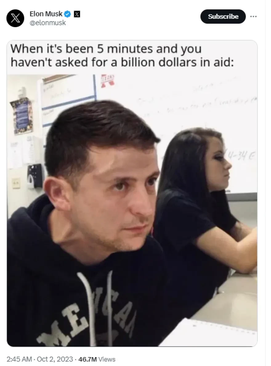 Το κοροϊδευτικό tweet του ιδιοκτήτη της πλατφόρμας περιλαμβάνει μια επεξεργασμένη με photoshop εικόνα του Ουκρανού προέδρου με μια έκφραση αγωνίας στο πρόσωπό του και διογκωμένες φλέβες στο κούτελο και τον λαιμό. «Όταν έχουν περάσει 5 λεπτά και δεν έχεις ζητήσει ένα δισεκατομμύριο δολάρια σε οικονομική βοήθεια» αναφέρει η λεζάντα της εικόνας, που αποτελεί τροποποίηση ενός πολύ γνωστού meme, που κυκλοφόρησε στο διαδίκτυο περίπου μια δεκαετία πριν.