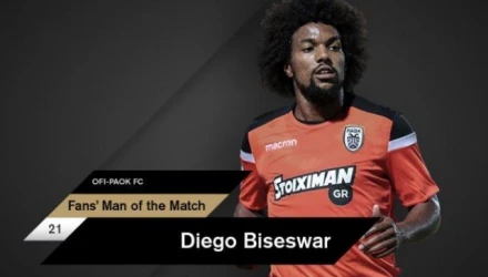 «Ο Ντιέγκο Μπίσεσβαρ αναδείχθηκε από το κοινό του paokfc.gr και του PAOK FC Official App, ως ο Fans’ Man of the Match της αναμέτρησης κόντρα στον ΟΦΗ στο Γεντί Κουλέ για την 3η αγωνιστικής της Super League Σουρωτή.